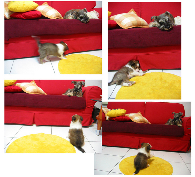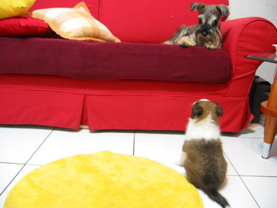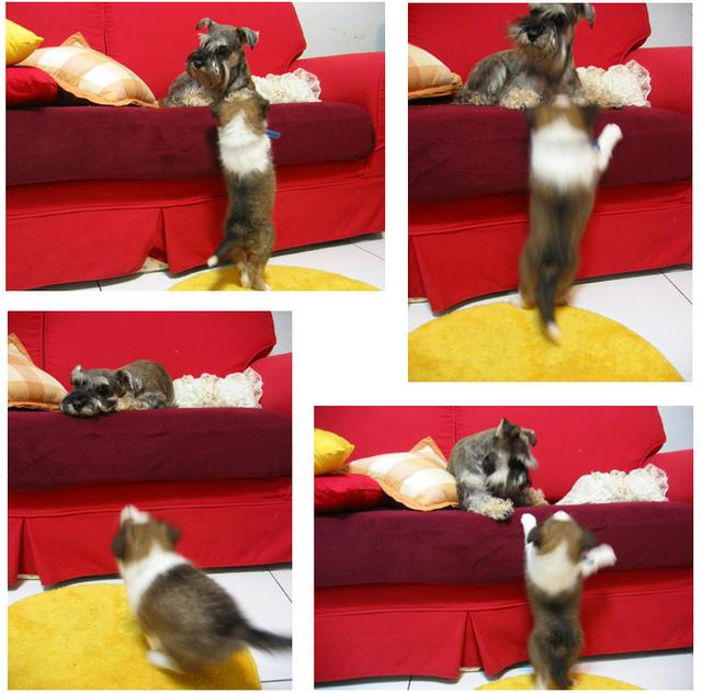 從這個小傢伙來我家以後整天就會跟著我的屁股跑不是咬我的尾巴就是咬我的屁股咬我的鬍子我的毛已經夠少了..泥馬幫幫忙厚.......真的有夠煩捏我在沙發上泥總咬不到了吧泥慢慢跳珼.小心摔個狗吃屎哦
