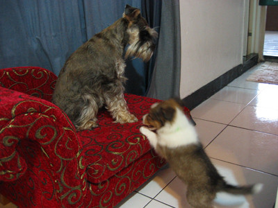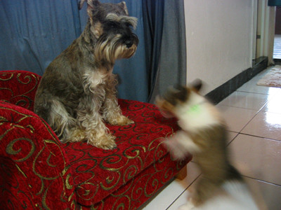 媽咪,他又在咬我的貴妃椅啦跳不上來就用咬的.真是沒風度ㄝ小心一點哦.......這麼愛跳呵...摔個狗吃屎了吧