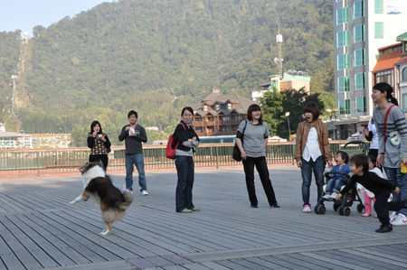 一群阿姨們圍著他們兩個輪流跟他們拍照