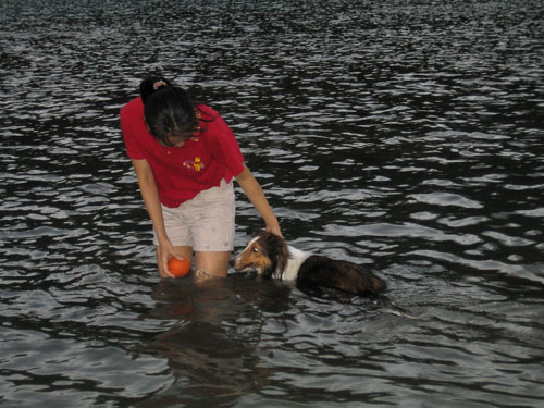 用阿波羅最喜歡的啾啾球讓牠在撖水裡面玩球再一步步往伸一點點的地方丟